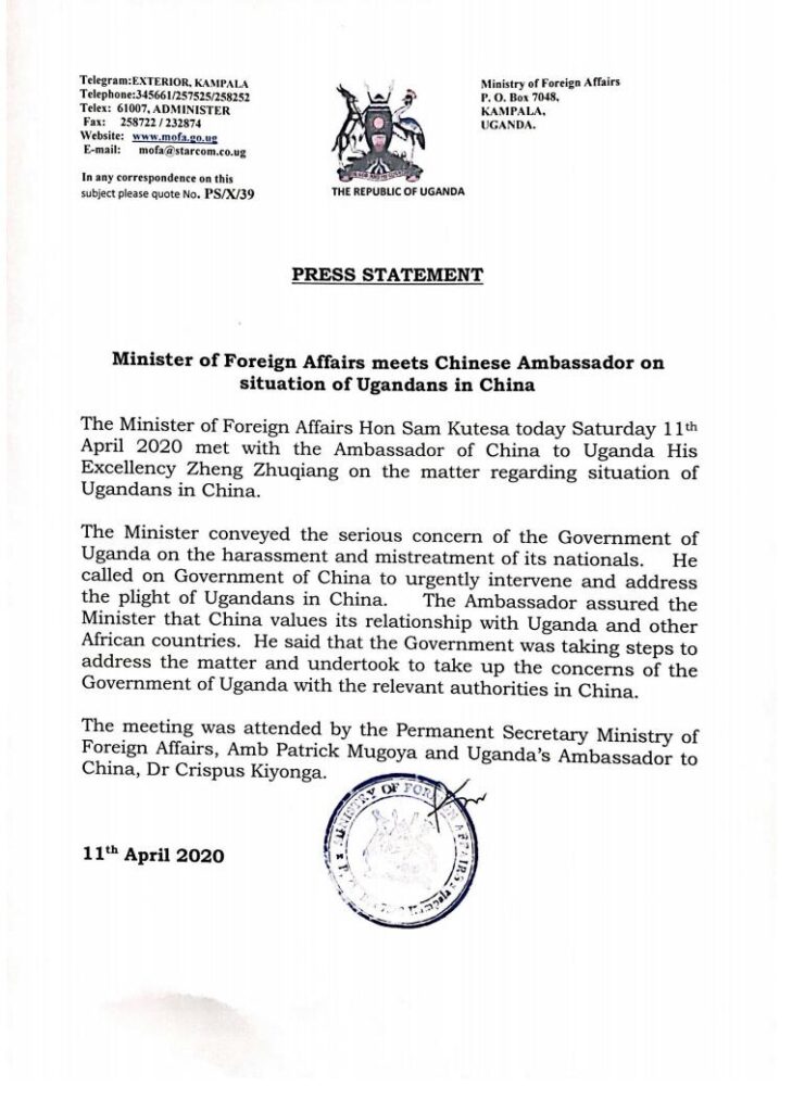 “The minister conveyed the serious concern of the Government of Uganda on the harassment and mistreatment of its nationals. He called on Government of China to urgently intervene and address the plight of Ugandans in China,” reads part of the statement.