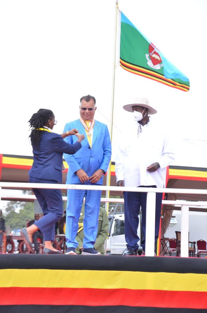 Kampala:– In a historic ceremony at Kololo Ceremonial Grounds, His Excellency President Yoweri Kaguta Museveni conferred the Distinguished Order of the Crested Crane (Grand Officer) upon Mr. Barot Harshad Maganbhai, the Chairman of Tirupati Development (U) Limited, recognising his exceptional contribution to Uganda’s national development. The award was presented during the NRM/A Victory Day Celebrations.